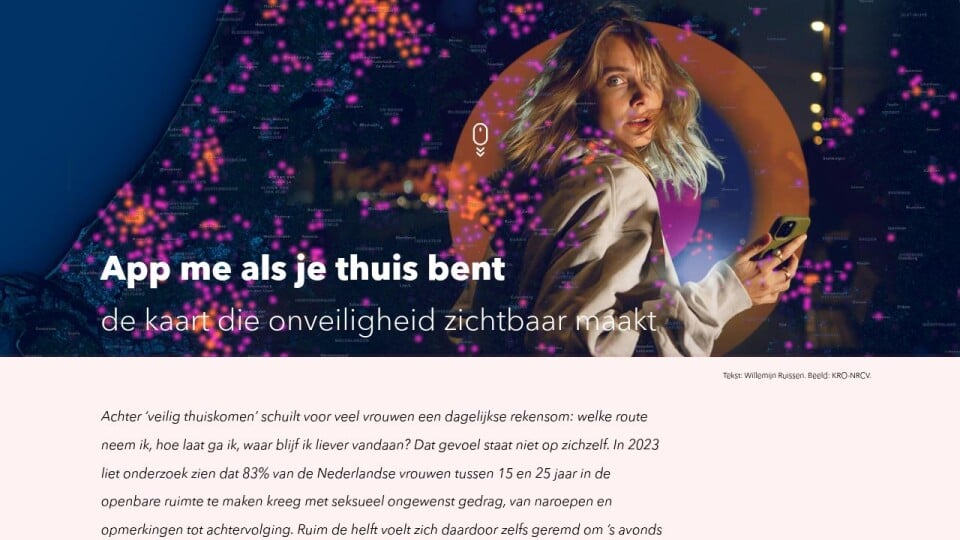 Achter ‘veilig thuiskomen’ schuilt voor veel vrouwen een dagelijkse rekensom: welke route neem ik, hoe laat ga ik, waar blijf ik liever vandaan? Dat gevoel staat niet op zichzelf. In 2023 liet onderzoek zien dat 83% van de Nederlandse vrouwen tussen 15 en 25 jaar in de openbare ruimte te maken kreeg met seksueel ongewenst gedrag, van naroepen en opmerkingen tot achtervolging. Ruim de helft voelt zich daardoor zelfs geremd om ’s avonds of in het donker naar buiten te gaan, óók als ze zelf niets ernstigs meemaakten. Pointer en het AD besloten daarom in 2024 niet alleen te onderzoeken waar en waarom vrouwen zich onveilig voelen, maar ook om vrouwen zelf het woord te geven. Dit op een manier die schaalbaar, herkenbaar en publiek zichtbaar is: via een online kaart waarop meldingen en ervaringen samenkomen. Eind 2025 kreeg die kaart een innovatie-impuls binnen het project App me als je thuis bent, inmiddels bekroond met de NPO Innovatie Award. Inzet van het project: niet alleen bewustwording, maar ook actie.