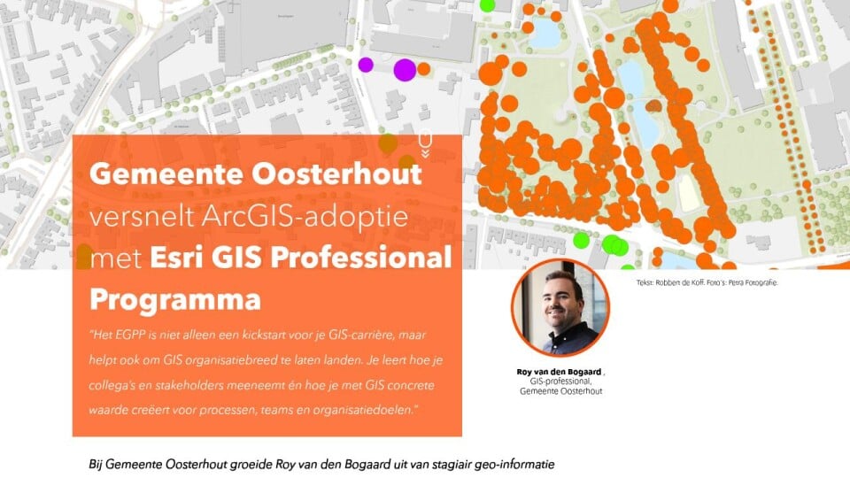 Bij Gemeente Oosterhout groeide Roy van den Bogaard uit van stagiair geo-informatie tot GIS-professional. Met het Esri GIS Professional Programma (EGPP) zette hij niet alleen een stevige technische basis neer, maar kreeg hij vooral zijn collega’s, van beleid tot buitendienst, mee in de mogelijkheden van GIS. Het resultaat: meer slimme apps, betere data en snellere besluitvorming.