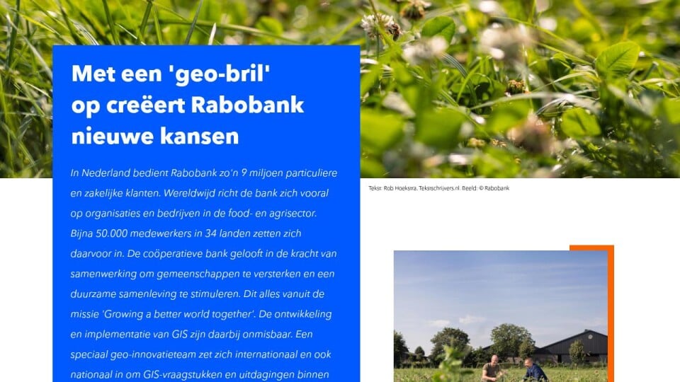 In Nederland bedient Rabobank zo'n 9 miljoen particuliere en zakelijke klanten. Wereldwijd richt de bank zich vooral op organisaties en bedrijven in de food- en agrisector. Bijna 50.000 medewerkers in 34 landen zetten zich daarvoor in. De coöperatieve bank gelooft in de kracht van samenwerking om gemeenschappen te versterken en een duurzame samenleving te stimuleren. Dit alles vanuit de missie 'Growing a better world together'. De ontwikkeling en implementatie van GIS zijn daarbij onmisbaar. Een speciaal geo-innovatieteam zet zich internationaal en ook nationaal in om GIS-vraagstukken en uitdagingen binnen de organisatie aan te pakken. Met een 'geo-bril' op vergaart Rabobank zo waardevolle inzichten en creëert ze nieuwe kansen, zowel voor klanten als medewerkers.