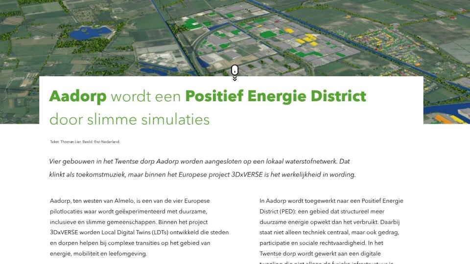 Aadorp is daarmee niet alleen een testlocatie, maar ook een inspiratiebron voor andere dorpen in Nederland en Europa. “Het mooie is dat we met 3DxVERSE ook gelijk nadenken hoe geleerde lessen gedeeld kunnen worden én ontwikkelde toepassingen gekopieerd kunnen worden. Als dit in Aadorp werkt, kan het overal werken”, aldus Maarten Welmers, strategisch business developer bij Esri Nederland.