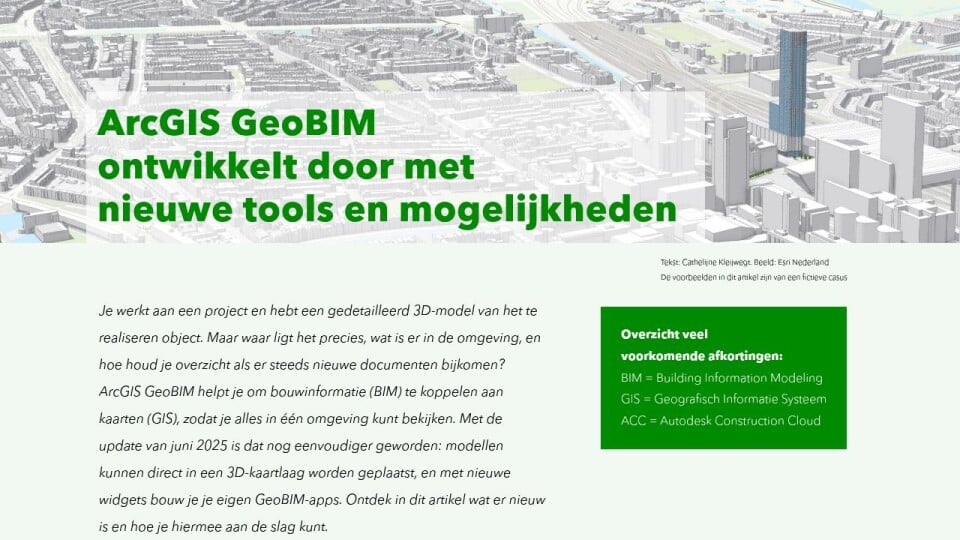 Je werkt aan een project en hebt een gedetailleerd 3D-model van het te realiseren object. Maar waar ligt het precies, wat is er in de omgeving, en hoe houd je overzicht als er steeds nieuwe documenten bijkomen? ArcGIS GeoBIM helpt je om bouwinformatie (BIM) te koppelen aan kaarten (GIS), zodat je alles in één omgeving kunt bekijken. Met de update van juni 2025 is dat nog eenvoudiger geworden: modellen kunnen direct in een 3D-kaartlaag worden geplaatst, en met nieuwe widgets bouw je je eigen GeoBIM-apps. Ontdek in dit artikel wat er nieuw is en hoe je hiermee aan de slag kunt.