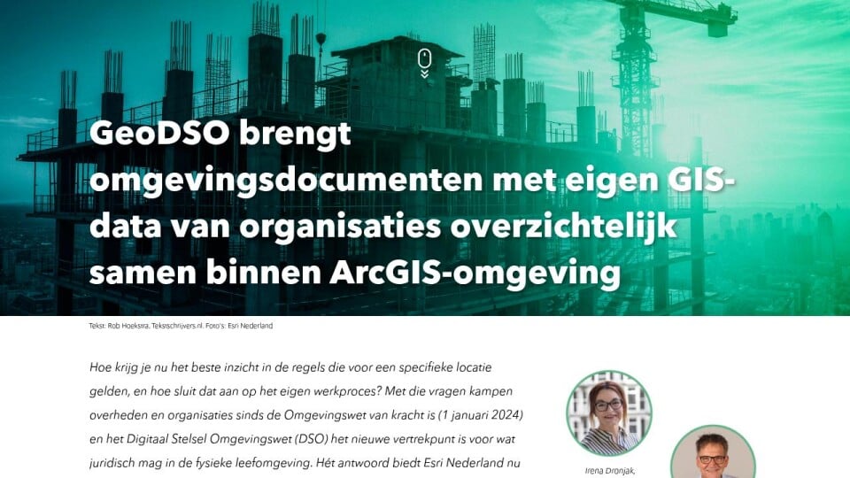 Hoe krijg je nu het beste inzicht in de regels die voor een specifieke locatie gelden, en hoe sluit dat aan op het eigen werkproces? Met die vragen kampen overheden en organisaties sinds de Omgevingswet van kracht is (1 januari 2024) en het Digitaal Stelsel Omgevingswet (DSO) het nieuwe vertrekpunt is voor wat juridisch mag in de fysieke leefomgeving. Hét antwoord biedt Esri Nederland nu met haar slimme oplossing GeoDSO. Deze innovatieve tool combineert, visualiseert en analyseert beleids- en juridische informatie uit het DSO binnen de vertrouwde ArcGIS- en GeoWeb-omgeving. Zo krijg je overzicht en ruimtelijk inzicht in een handomdraai.