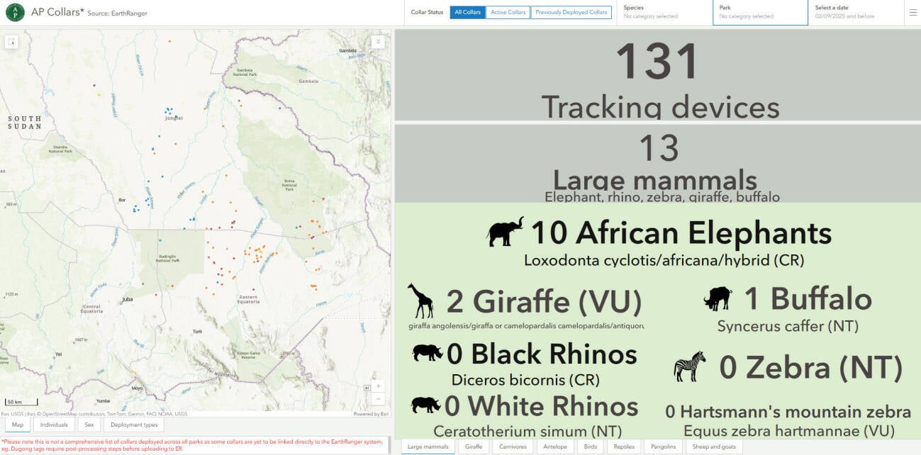 voor apps, kaartlagen en items die openbaar gedeeld worden en het volgen van trainingen. Daarbij wordt er in de parken heel veel gebruik gemaakt van ArcGIS Survey123, voor dataverzameling met lokale inwoners, zoals waar mensen en dieren met elkaar in conflict komen.” Maar ArcGIS is niet het enige systeem dat ze organisatiebreed gebruiken bij African Parks. Ieder park maakt gebruik van Earthranger, een tool waarin realtime wordt bijgehouden wat er gebeurt in de parken. Hierin zijn meerdere databronnen gekoppeld, zoals data van vliegtuigen, Garmins van rangers en trackers van dieren. “Earthranger is hoofdzakelijk een viewer, de meeste parken gebruiken de tool om de actuele situatie te monitoren. Er worden alleen basic analyses mee gedaan, zoals heatmaps, sliders en overlays van verschillende lagen,” legt Inge uit. “Momenteel wordt er gewerkt aan een integratie van Earthranger met ArcGIS. Dan kunnen we de data uit Earthranger weer koppelen aan andere databronnen en er complexere analyses mee gaan doen. Zo willen we nog meer waarde halen uit alle data die we verzamelen.”