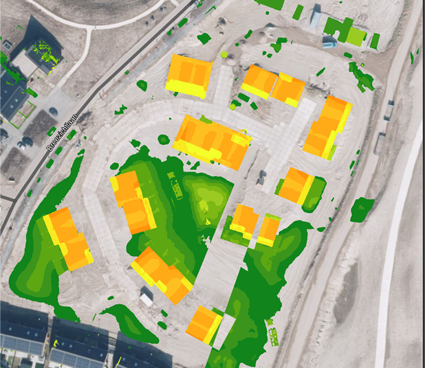 In de afbeelding hiernaast ziet u het resultaat van een vergelijkbare analyse, met een jaar tijdverschil. Op de afbeelding zijn door geel de nieuwe aanbouwen duidelijk zichtbaar. Het groen op de kaart toont aan waar de grond verlaagd is ten opzichte van het jaar ervoor.