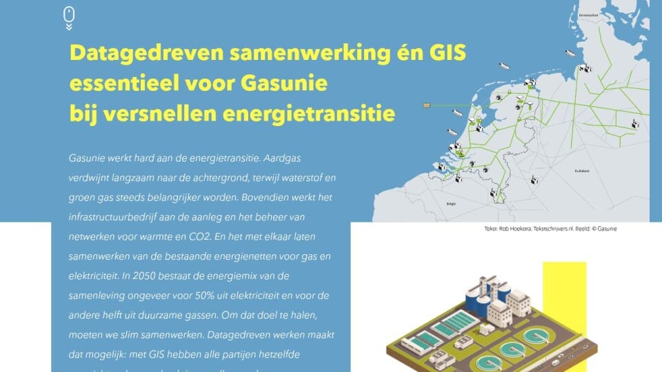 Gasunie werkt hard aan de energietransitie. Aardgas verdwijnt langzaam naar de achtergrond, terwijl waterstof en groen gas steeds belangrijker worden. Bovendien werkt het infrastructuurbedrijf aan de aanleg en het beheer van netwerken voor warmte en CO2. En het met elkaar laten samenwerken van de bestaande energienetten voor gas en elektriciteit. In 2050 bestaat de energiemix van de samenleving ongeveer voor 50% uit elektriciteit en voor de andere helft uit duurzame gassen. Om dat doel te halen, moeten we slim samenwerken. Datagedreven werken maakt dat mogelijk: met GIS hebben alle partijen hetzelfde overzicht en kunnen besluiten sneller worden genomen.