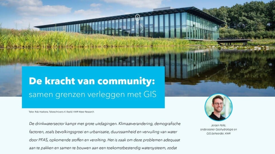 De drinkwatersector kampt met grote uitdagingen. Klimaatverandering, demografische factoren, zoals bevolkingsgroei en urbanisatie, duurzaamheid en vervuiling van water door PFAS, opkomende stoffen en verzilting. Het is zaak om deze problemen adequaat aan te pakken en samen te bouwen aan een toekomstbestendig watersysteem, zodat er voldoende en kwalitatief goed drinkwater beschikbaar is en blijft. Het onderzoeksinstituut KWR Water Research neemt daarin het voortouw. Vanuit haar motto 'Bridging Science to Practice' speelt ze een steeds grotere rol in nationale en internationale samenwerkingsverbanden. Bij het oplossen van de vraagstukken waar drinkwaterbedrijven mee kampen gebruiken ze daarbij regelmatig ruimtelijke data en GIS-analyses.
